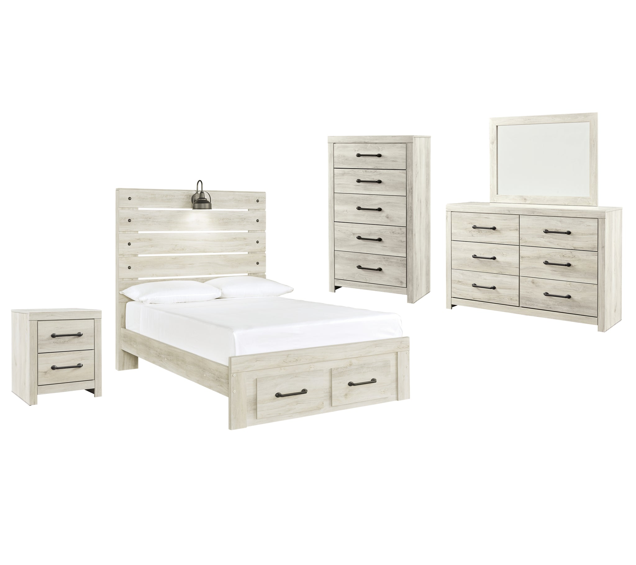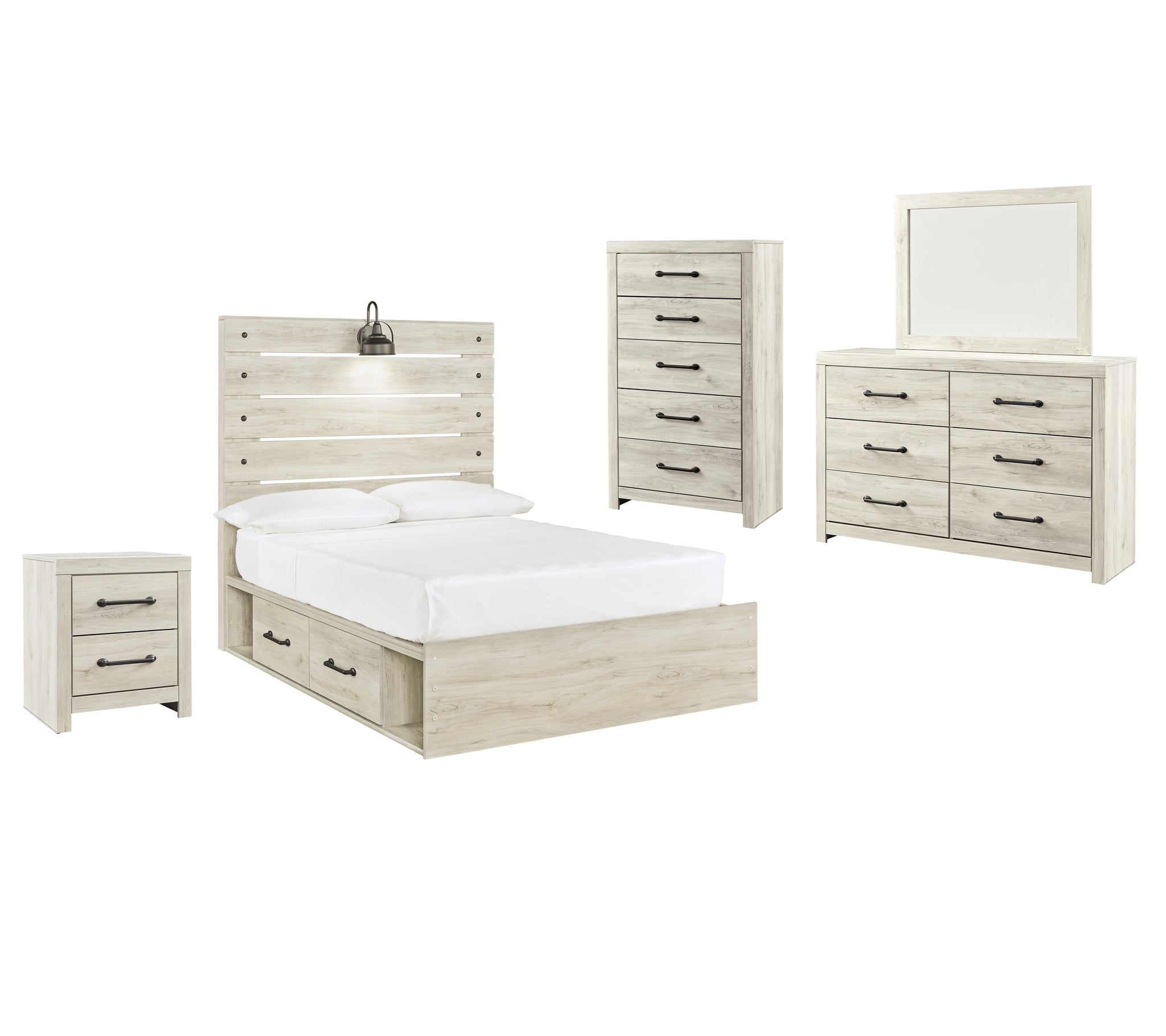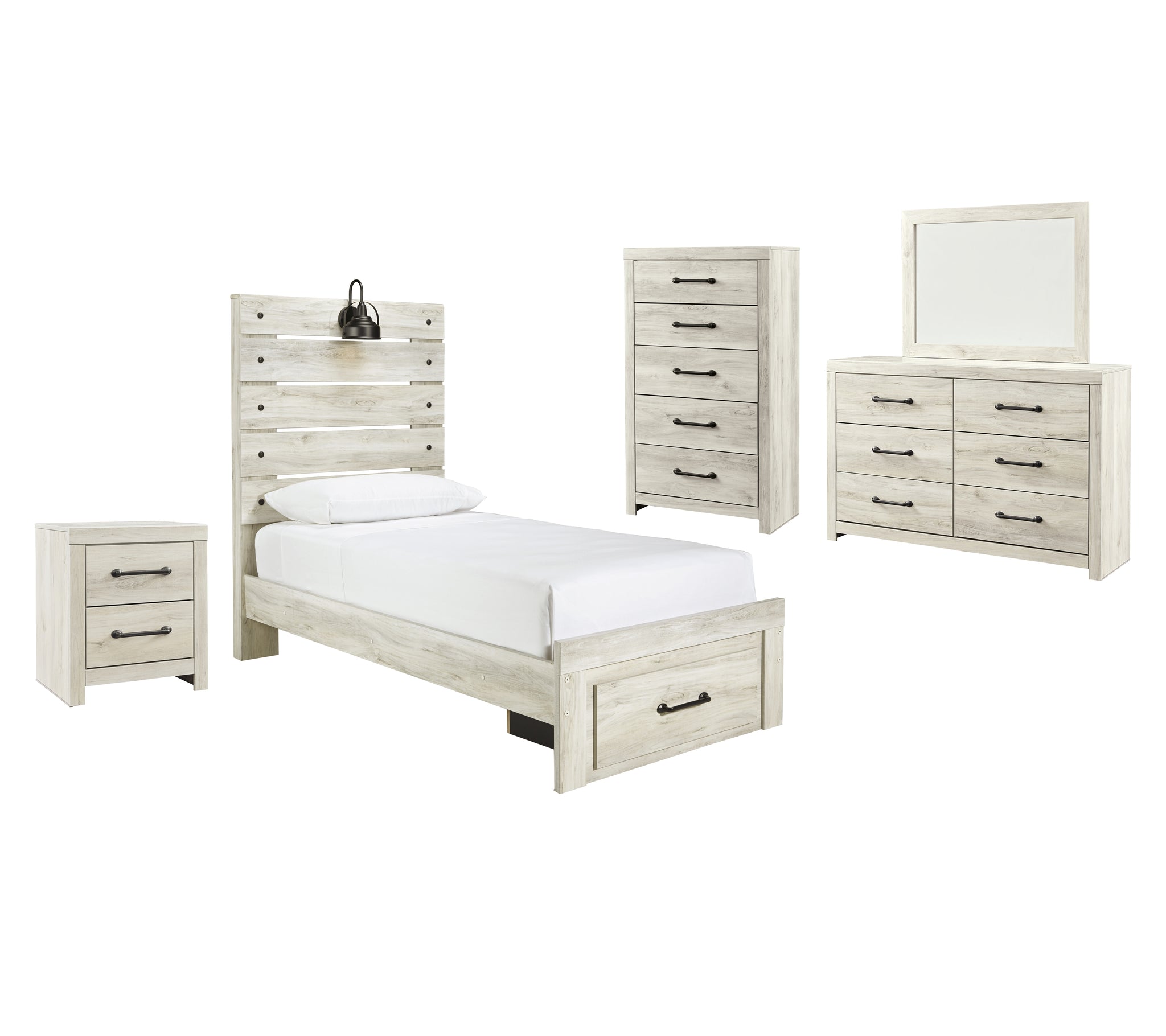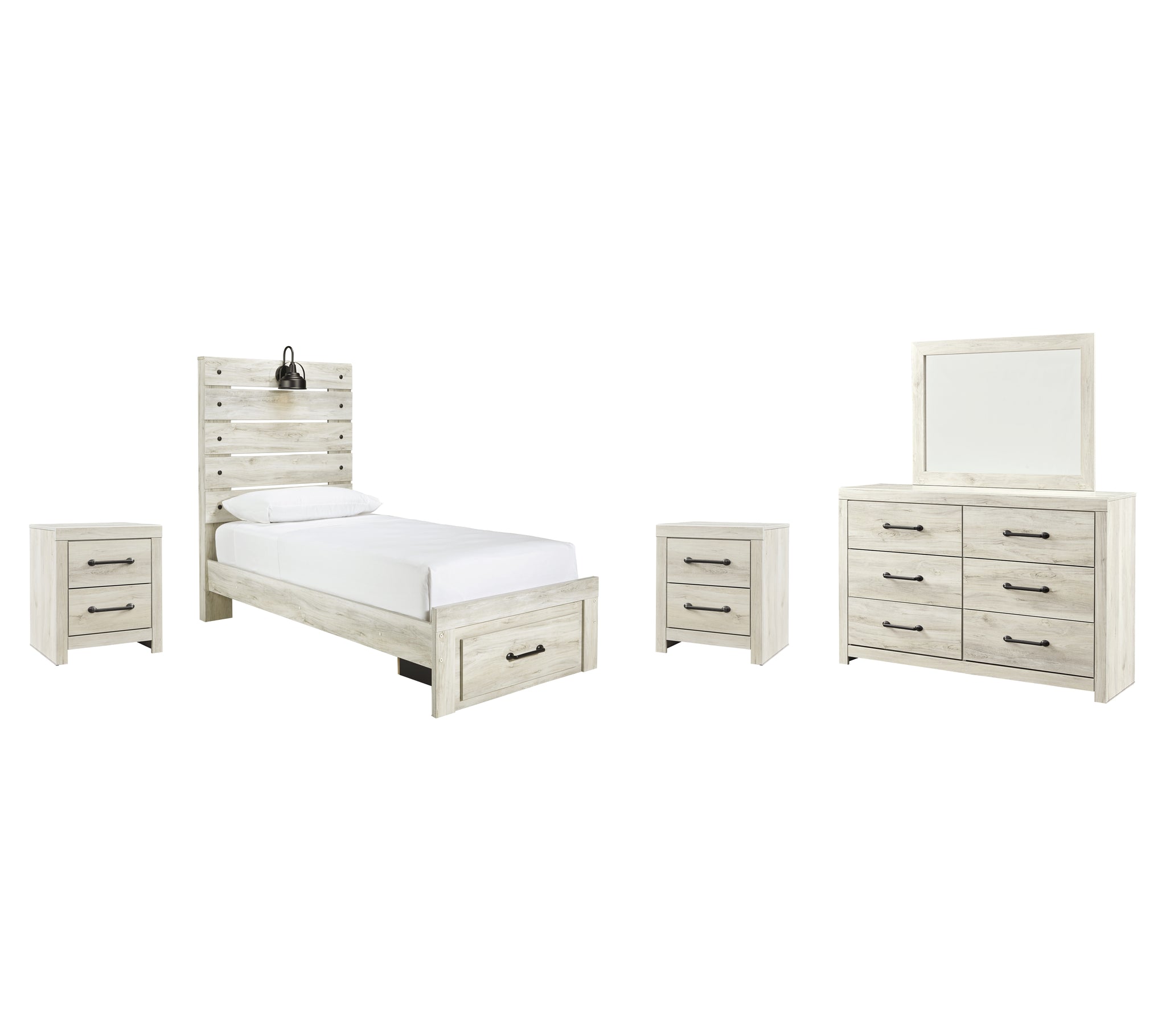 Includes: 2 Nightstand,1 Dresser and Mirror,1 Twin Panel Bed with 2 Storage Drawers