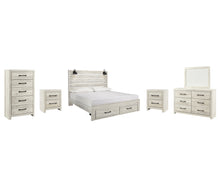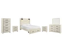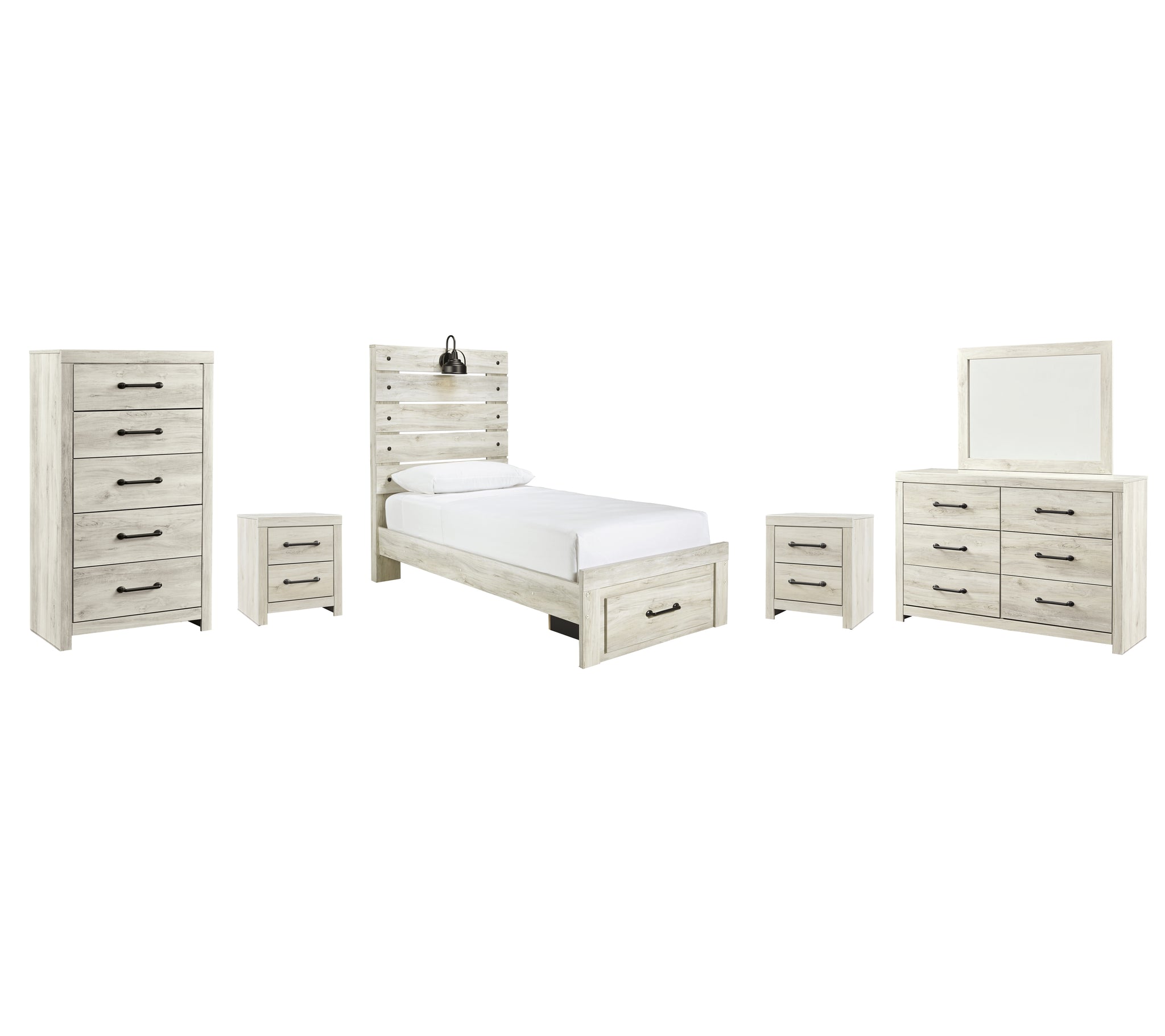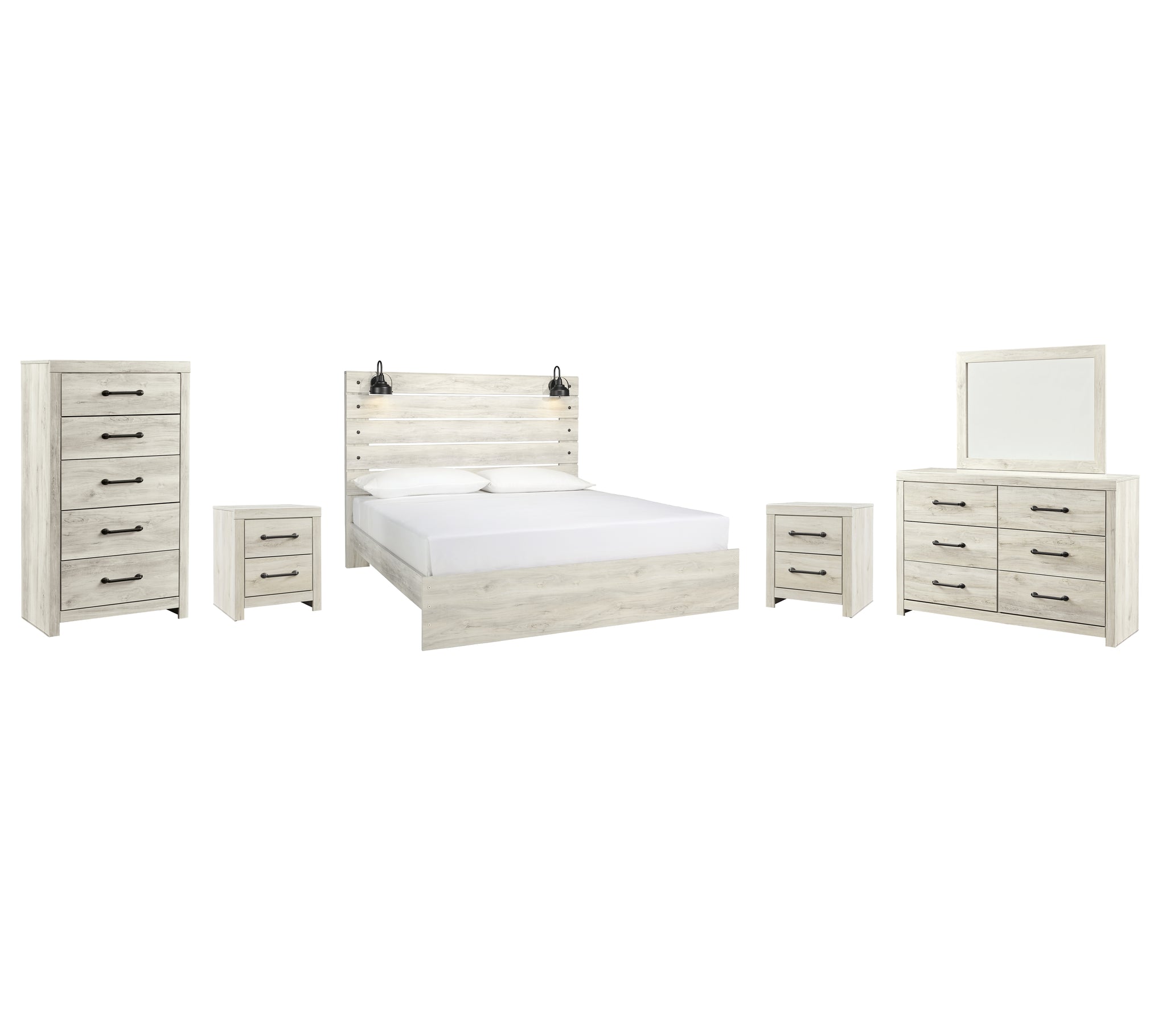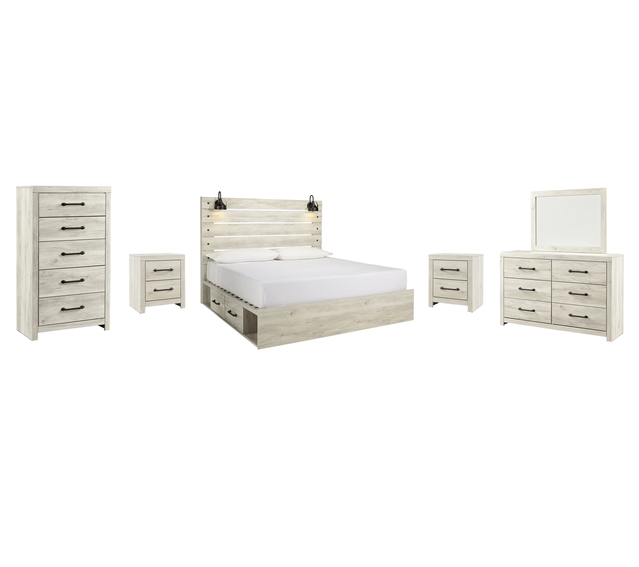 Includes: 1 Chest of Drawers,2 Nightstand,1 Dresser and Mirror,1 Queen Panel Bed with 2 Storage Drawers