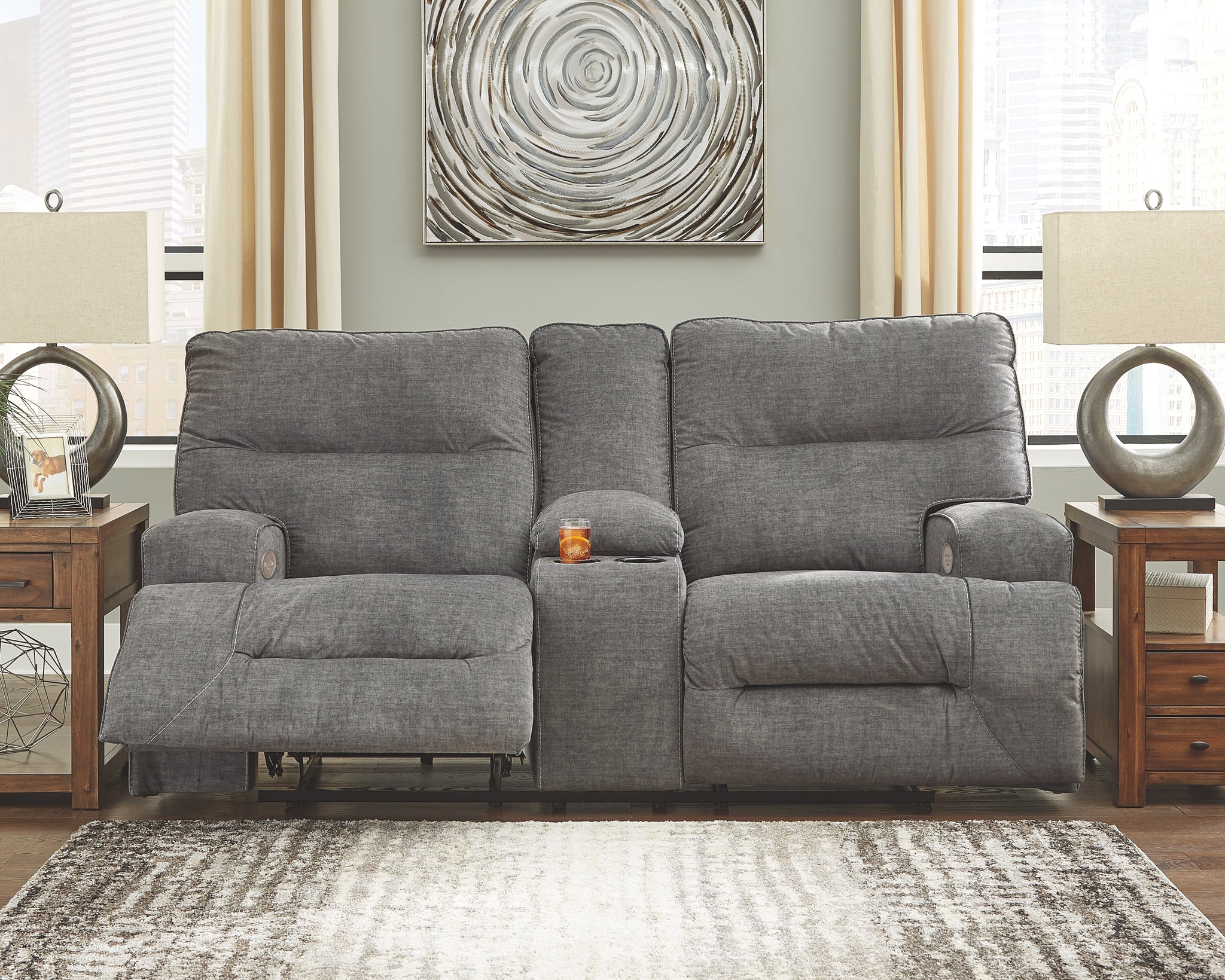 Coombs Signature Design by Ashley Charcoal Reclining Loveseat with Console, 84W x 38D x 42H, 210lbs.