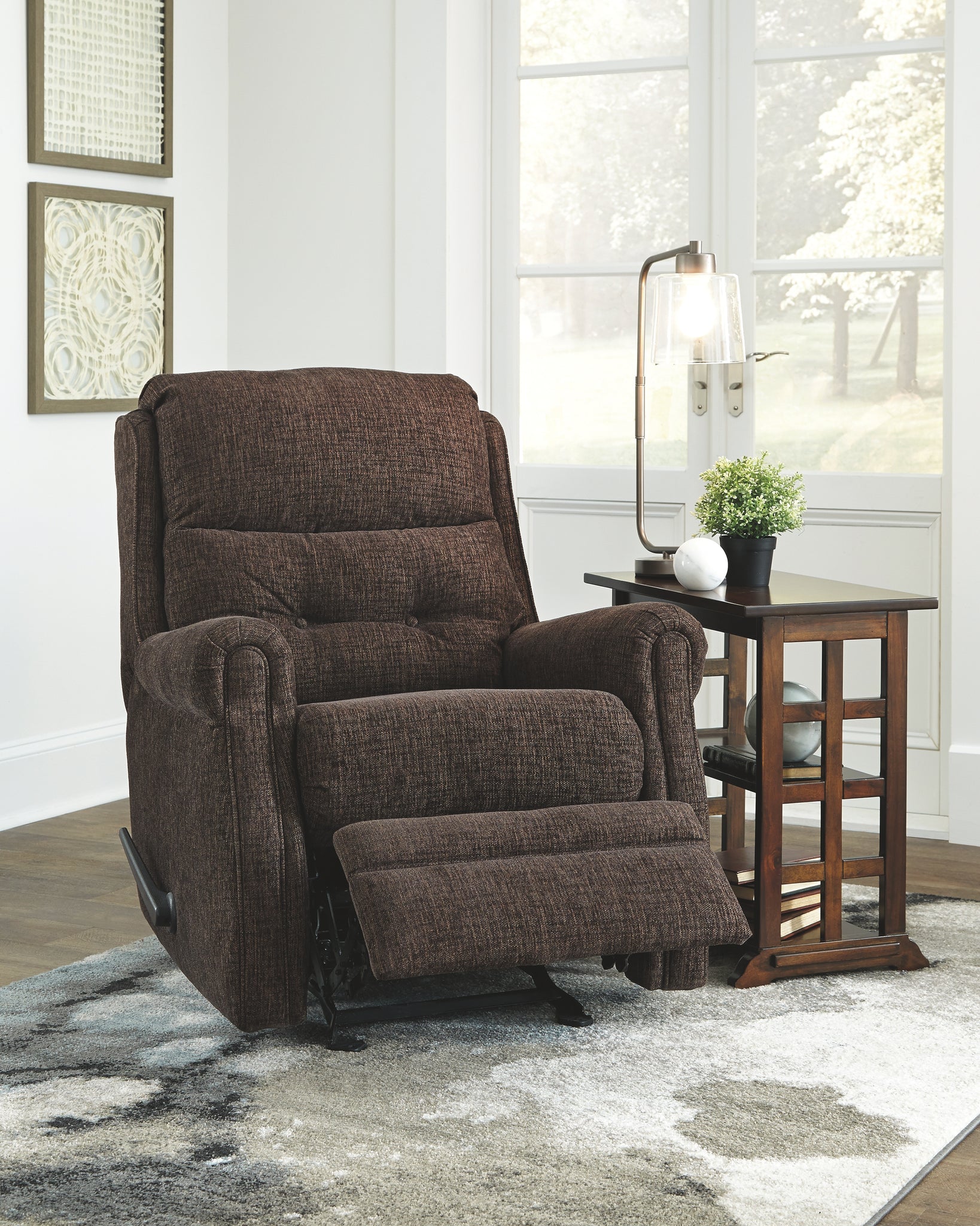 This chenille-textured recliner grants you the resting power you deserve. Refined sizing saves space without sacrificing comfort. With just one pull it reclines to the position of your liking. And talk about style. Gorgeous burgundy hue is accompanied by slim arms and button tufting on the lumbar cushion. Manufacturer Warranty: 365 Days