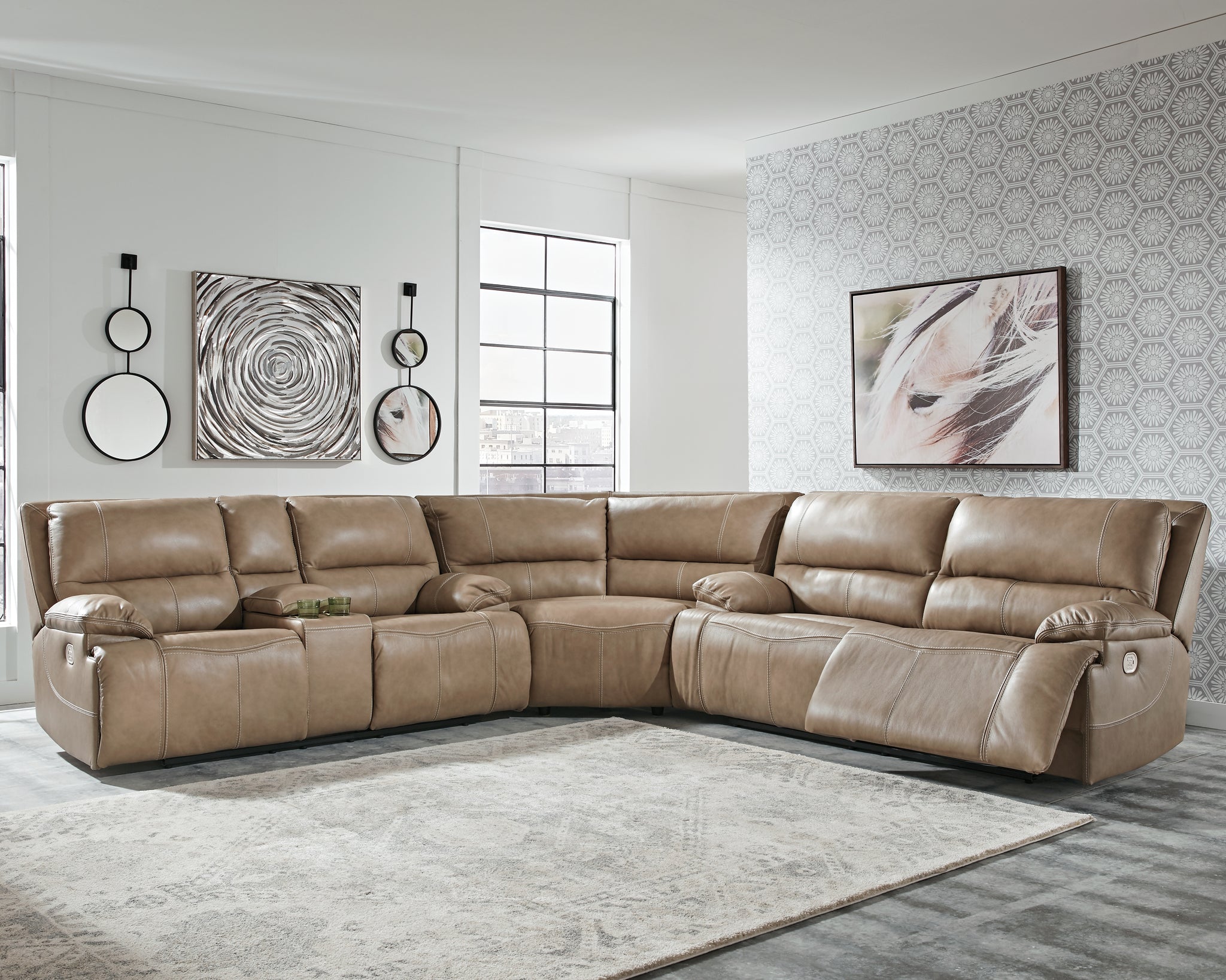 Life is so much better when you can enjoy the pleasure of real leatherat a price to put you at ease. Thats exactly what you get with this 3-piece sectional with power. Thanks to real leather throughout the seating area youve got a reclining sectional that feels like a million bucks but wont break the bank. Tailored to those with an eye for contemporary design this power reclining sectional is dressed to impress with an upscale matte finish clean-lined divided back tufting distinctive jumbo stitching and chic pillow top armrests. Perhaps best of all Easy View power adjustable headrests let you recline back and still have a primo view of the TV. Manufacturer Warranty: 365 Days