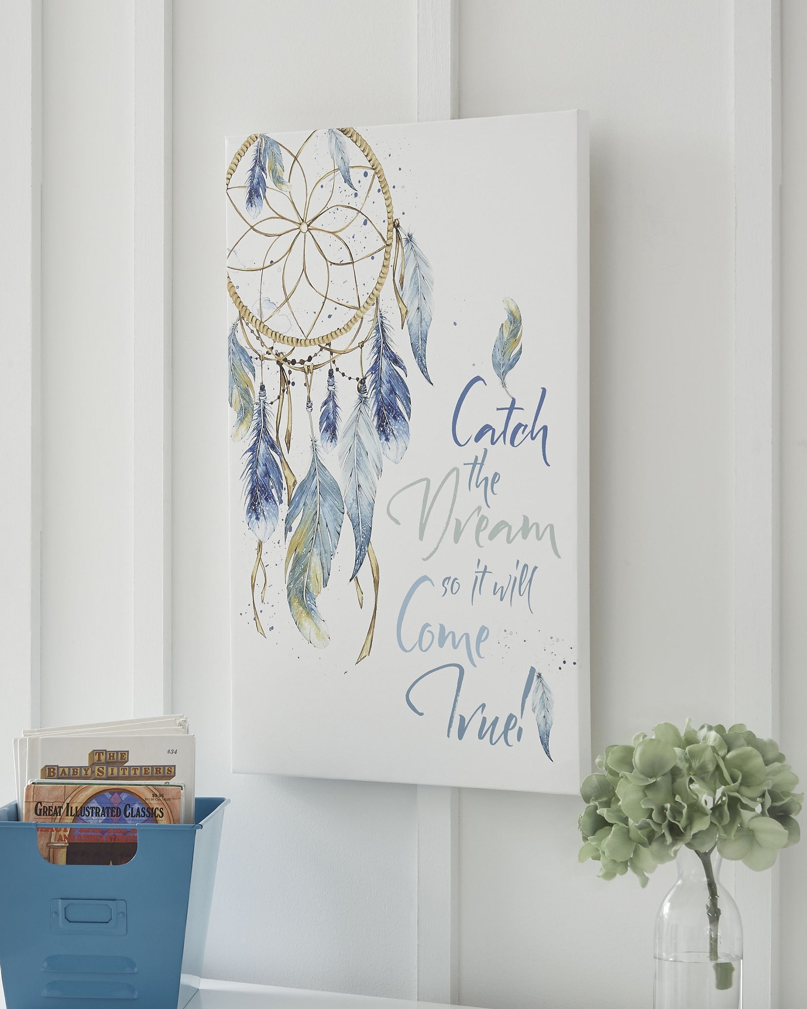 Wispy in light faded blues this wall art set holds a sense of serenity for the avid dreamer. A faded herringbone print creates the illusion of being up in the clouds and inspirational quotes coddle your childs artistic heart. Hang up this pair of canvases side by side or spread the inspiration throughout the room. Manufacturer Warranty: 0 Days