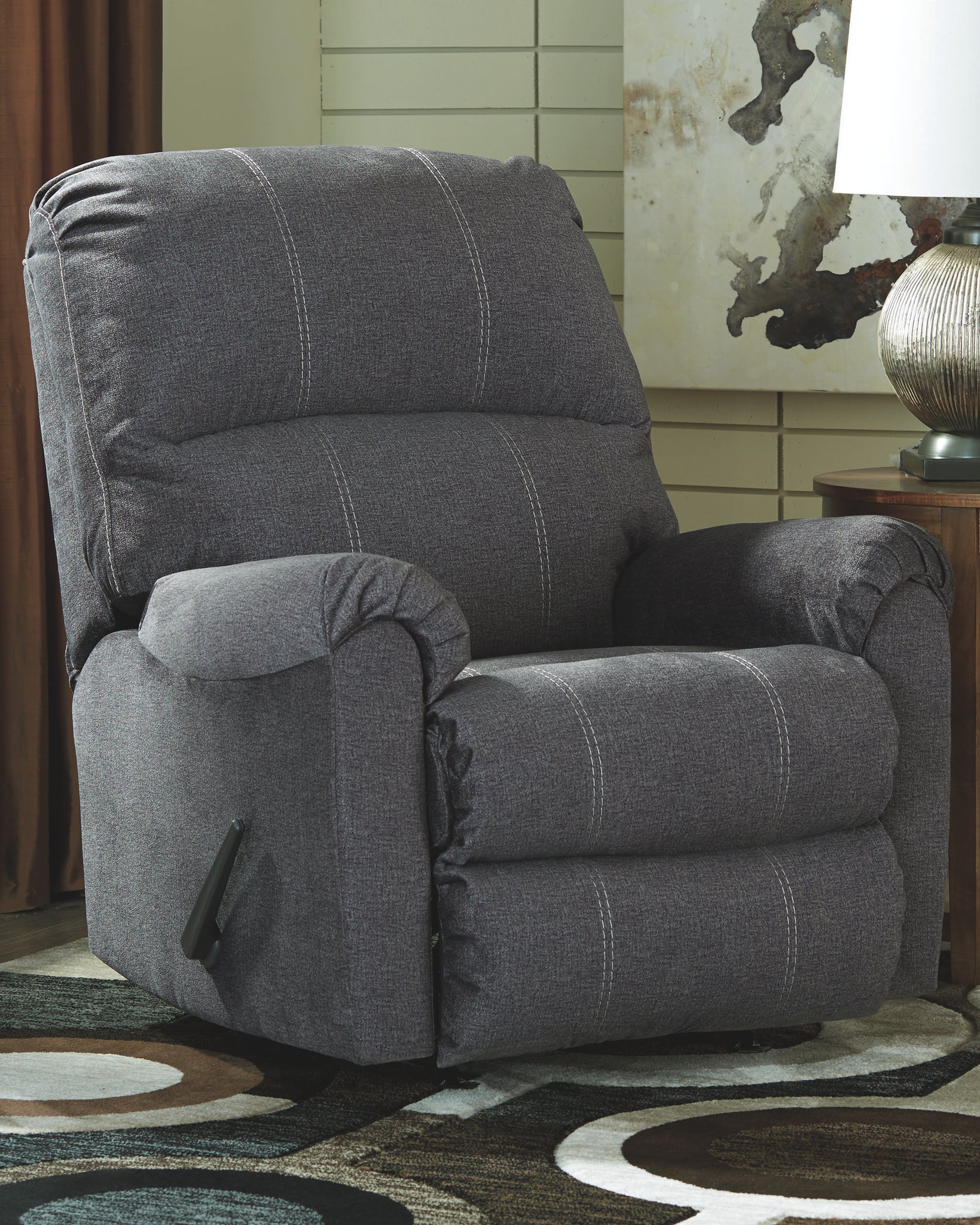 Dressed to impress even the most discerning urban hipster this rocker recliner in charcoal gray rocks a cool look with an even better feel. Rest assured this designer recliner is covered in a padded microfiber upholstery thats love at first touch. Accentuating the clean lines and channel tufting prominent jumbo stitching that adds a fresh fashion-forward element and distinctive flair. Manufacturer Warranty: 365 Days